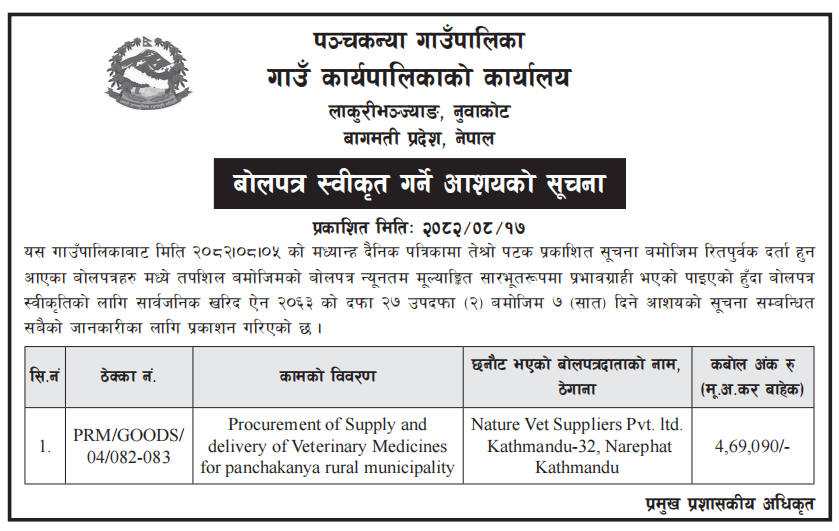 » बोलपत्र स्वीकृत गर्ने आशयको सूचना !!
